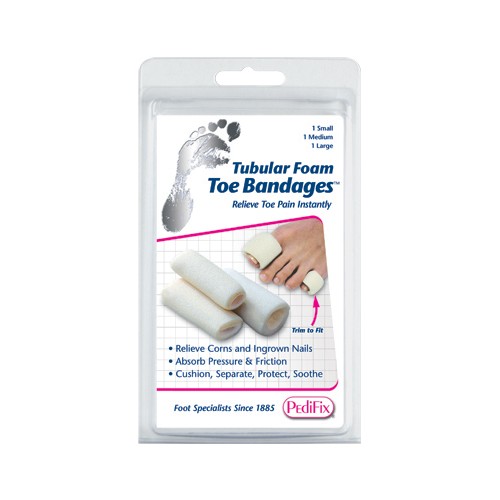Tubular-Foam Toe Bandages relieve corns ingrown nails and other irritations by surrounding and protecting toes with soft cotton-lined foam * They also cushion and separate toes that rub while reducing pressure and friction * Bandages compress to fit comfortably in shoes * Make shoes more comfortable * Align crooked overlapping toes * Scissor-trimmable for a custom fit * Each package contains three 3-inch long bandages *