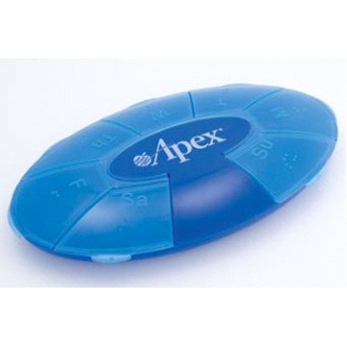 A unique attractive shape * Easy to read raised letters and Braille markings * Lids that snap securely shut * Great for travel * Opaque base with (translucent) blue lavender berry or green lids * 7 extra large compartments *