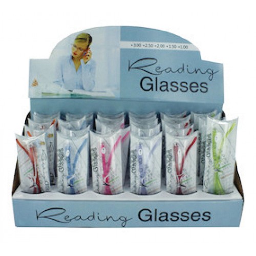 * These reading glasses are frameless come in translucent candy-like colors and are incredibly light weight * Each display includes 30 pairs of glasses and contain 6 of the following powers: +3.00 +2.50 +2.0 +1.50 and +1.00 * Colors include 5 of each of the following: burnt orange light blue pink purple red and green * All glasses are packaged in simple PDQ making shelf display simple and easy